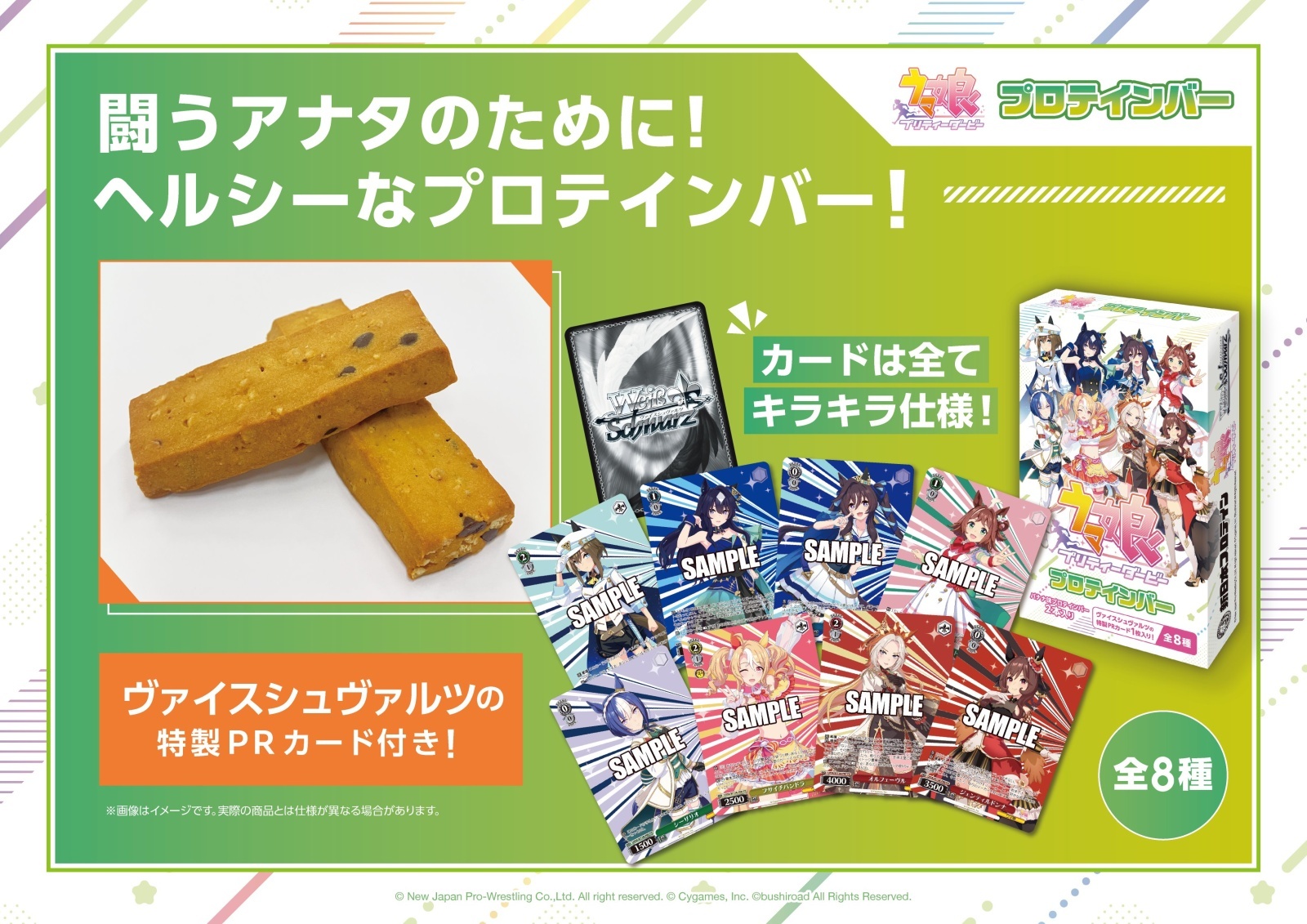 製品仕様 | 1パック プロテインバー2本+ヴァイスシュヴァルツ PRカード1枚入り(カード全8種) 1箱 8パック カートン 12箱 賞味期限 2026年8月 |