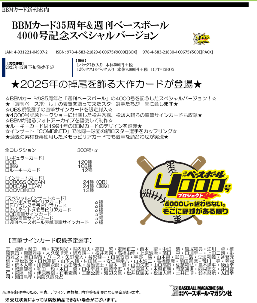 BBM カード35周年&週刊ベースボール 4000号記念スペシャルバージョン【25年12月下旬発売】 [4931221049072]