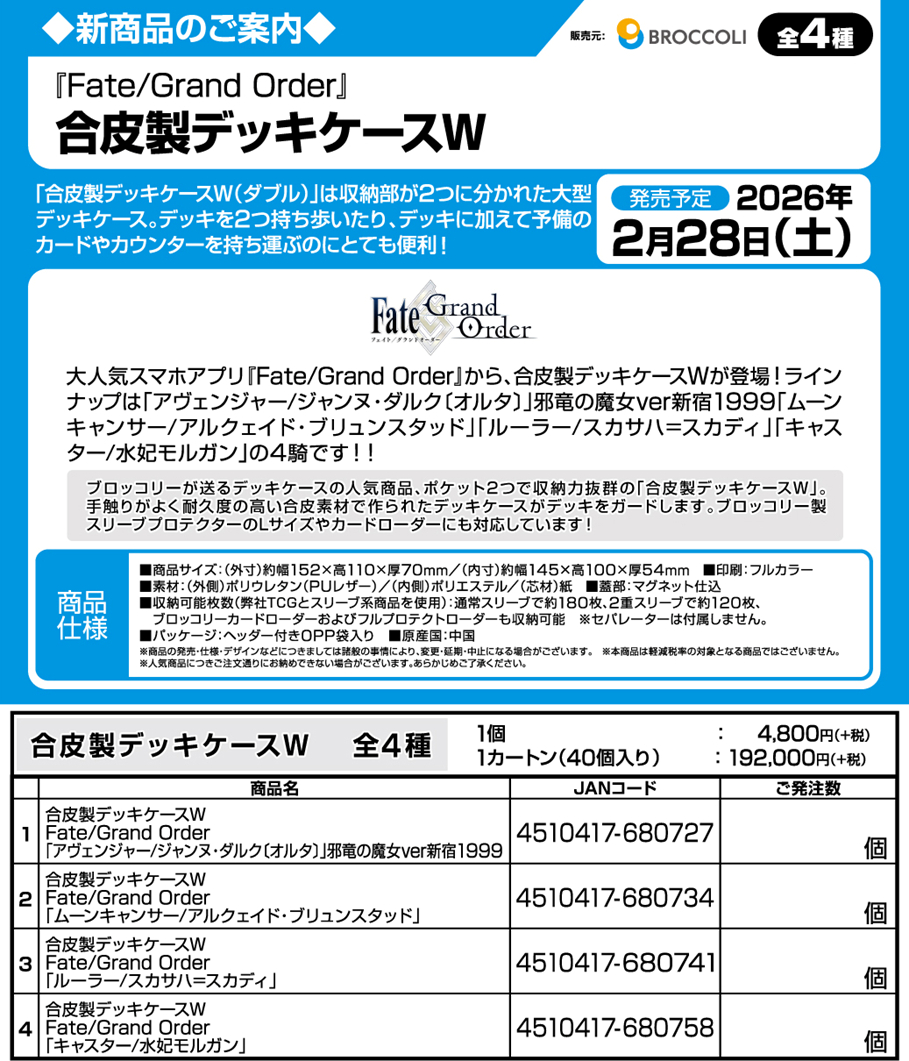 大人気スマホアプリ『Fate/Grand Order』から、合皮製デッキケースWが登場! ラインナップは「アヴェンジャー/ジャンヌ・ダルク〔オルタ〕」邪竜の魔女ver新宿1999 「ムーンキャンサー/アルクェイド・ブリュンスタッド」 「ルーラー/スカサハ=スカディ」「キャスター/水妃モルガン」の4騎です!! ブロッコリーが送るデッキケースの人気商品、ポケット2つで収納力抜群の「合皮製デッキケースW」。 手触りがよく耐久度の高い合皮素材で作られた大型ケースが、あなたのデッキをガードします! ブロッコリー製スリーブプロテクターのLサイズやカードローダーにも対応しています! ※画像は商品デザインではなくイメージになります。 加工の関係で若干色の違う部分がある場合がございますので、ご了承ください。 |