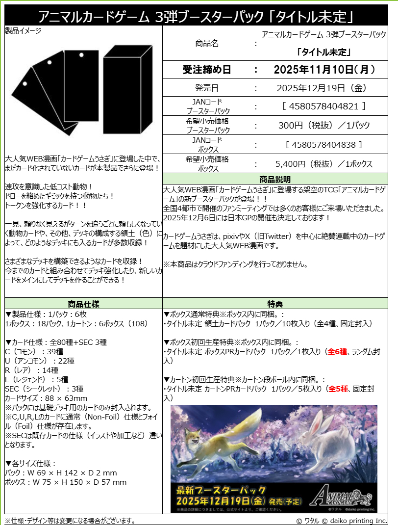 【予約商品】アニマルカードゲーム 3弾ブースターパック 「タイトル未定」 BOX(18パック入り)【25年12月19日発売】 [4580578404821]
