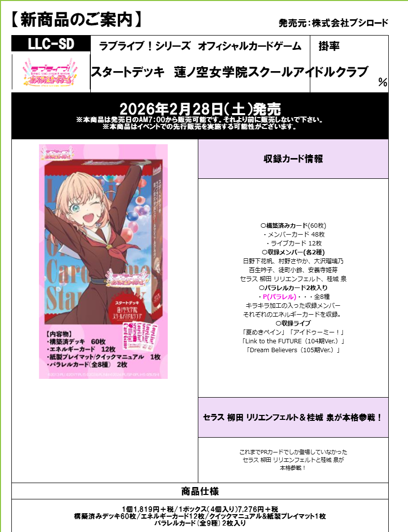 収録カード情報 〇構築済みカード(60枚) ・メンバーカード 48枚 ・ライブカード 12枚 〇収録メンバー(各2種) 日野下花帆、村野さやか、大沢瑠璃乃 百生吟子、徒町小鈴、安養寺姫芽 セラス 柳田 リリエンフェルト、桂城 泉 〇パラレルカード2枚入り ・P(パラレル)・・・全8種 キラキラ加工の入った収録メンバー それぞれのエネルギーカードを収録。 〇収録ライブ 「夏めきペイン」「アイドゥーミー!」 「Link to the FUTURE(104期Ver.)」 「Dream Believers(105期Ver.)」 ラブライブ!シリーズ オフィシャルカードゲームとは 「ラブライブ!シリーズ オフィシャルカードゲーム」は集めたカードで競い合う1対1の対戦カードゲーム。 「みんなでつくるカードゲーム」をコンセプトにルールの一部や、今後の登場“スクールアイドル”など あなたの意見で未来が変わる! ※ こちらの商品は人気商品のため、メーカー様からの納品数カットや分納となる可能性がございます。 あらかじめご了承ください。 |