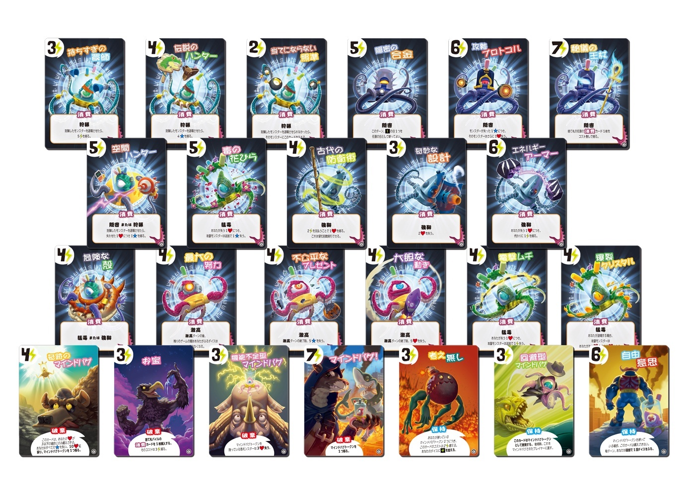 | 製品仕様 | <内容物> モンスターボード 3枚、モンスターフィギュア+スタンド 3組、『キング・オブ・トーキョー』用進化カード 24枚、 マインドバグトークン 8枚、パワーカード 24枚、早見表 6枚、ルールブック 1冊、モンスタートークン 3つ |