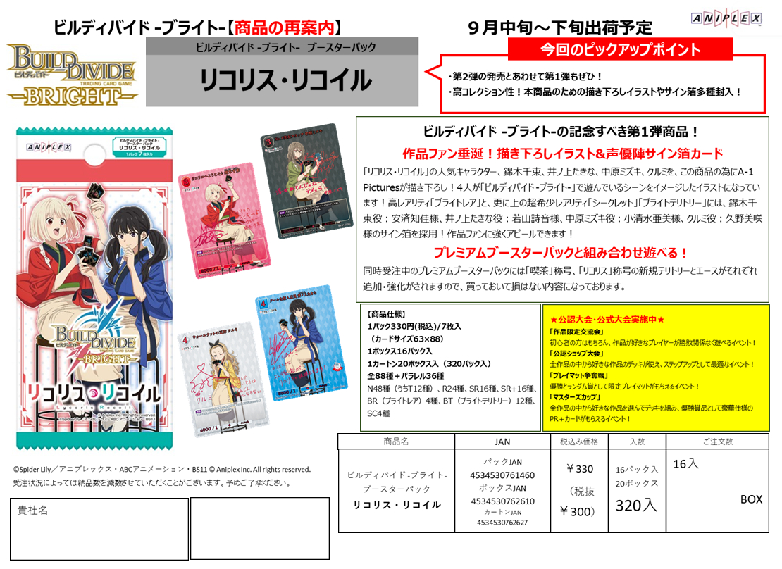 【再入荷予約商品】ビルディバイド -ブライト- ブースターパック 「リコリス・リコイル」 BOX(16パック入り)【25年12月上旬再入荷】 [4534530761460]