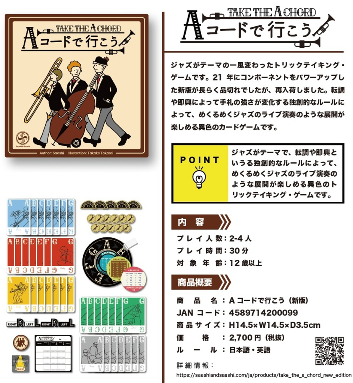ジャズがテーマの一風変わったトリックテイキング・ゲーム! プレイ人数:2〜4人用 プレイ時間:30分 対象年齢:8才以上 箱サイズ:145×145×35mm ※ こちらの商品は人気商品のため、メーカー様からの納品数カットや分納となる可能性がございます。 あらかじめご了承ください。 ※ゲームのプレイに支障のない初期傷や軽微な外装のフィルム破損等につきましては一切補償できません。 ご了承ください。 |