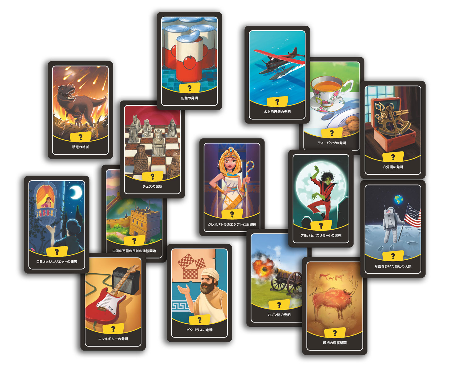 シェークスピアが「ロミオとジュリエット」を発表した当時、 ティーバックでいれた紅茶を味わうことはできたでしょうか? その時みんなブルージーンズをはいていたでしょうか? その時すでに歯ブラシを使っていましたか? 歴史上の出来事を、年代順に正しく並べてみよう! 「タイムライン」は、歴史雑学カードゲームです。 96枚のカードそれぞれには、歴史上の出来事と、それが発生した年(西暦)が記されています。 このカードを年代順に正しく並べていくのがこのゲームの目的です。 遊び方は簡単で、楽しみながら歴史や雑学も身につく、子どもから大人までエキサイティングにプレイできるカードゲームです。 また、リニューアル版の他の「タイムライン」のセットと組み合わせると、より楽しく、挑戦しがいのあるゲームをプレイできます。 ゲームの目的は、他のプレイヤーより先に自分のカードすべてをタイムラインに置くことです。 自分の手番が来たら、自分のカード1枚を、年代順の正しいと思った「時点」に配置します。 間違った場合は、そのカードを捨て札にして、新しいカード1枚を引きます。 こうして最初に自分のカードが無くなったプレイヤーが勝者です。 家族や友達との集まりに、そして歴史好きのあなたにも―― 「タイムライン」は、みんなで楽しめる知的エンタメゲームです。 シンプルなルールで、子どもから大人まで誰でもすぐにプレイ可能。 歴史の出来事を時系列で並べながら、驚きと発見が次々と飛び出します! 「えっ、これってそんな昔の話だったの!?」 そんな驚きが、笑いと会話を生み出す最高のひとときに。 知識と直感を武器に、あなたの歴史センスを試してみよう! さあ、みんなでタイムラインを完成させよう! ゲームデザイン: フレデリック・アンリ プレイ人数:2〜6人用 対象年齢:8歳以上 プレイ時間:約15分 ※ こちらの商品は人気商品のため、メーカー様からの納品数カットや分納となる可能性がございます。 あらかじめご了承ください。 ※ゲームのプレイに支障のない初期傷や軽微な外装のフィルム破損等につきましては一切補償できません。 ご了承ください。 (25年11月21日ご予約締め切り予定 ※より早期に受付終了する可能性がございます) |