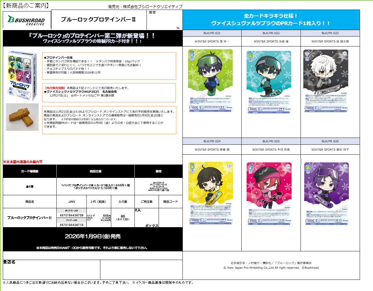 | 製品仕様 | 1パック プロテインバー2本+カード1枚入り(カード全6種) 1箱 8パック カートン 12箱 賞味期限 2026年11月 |