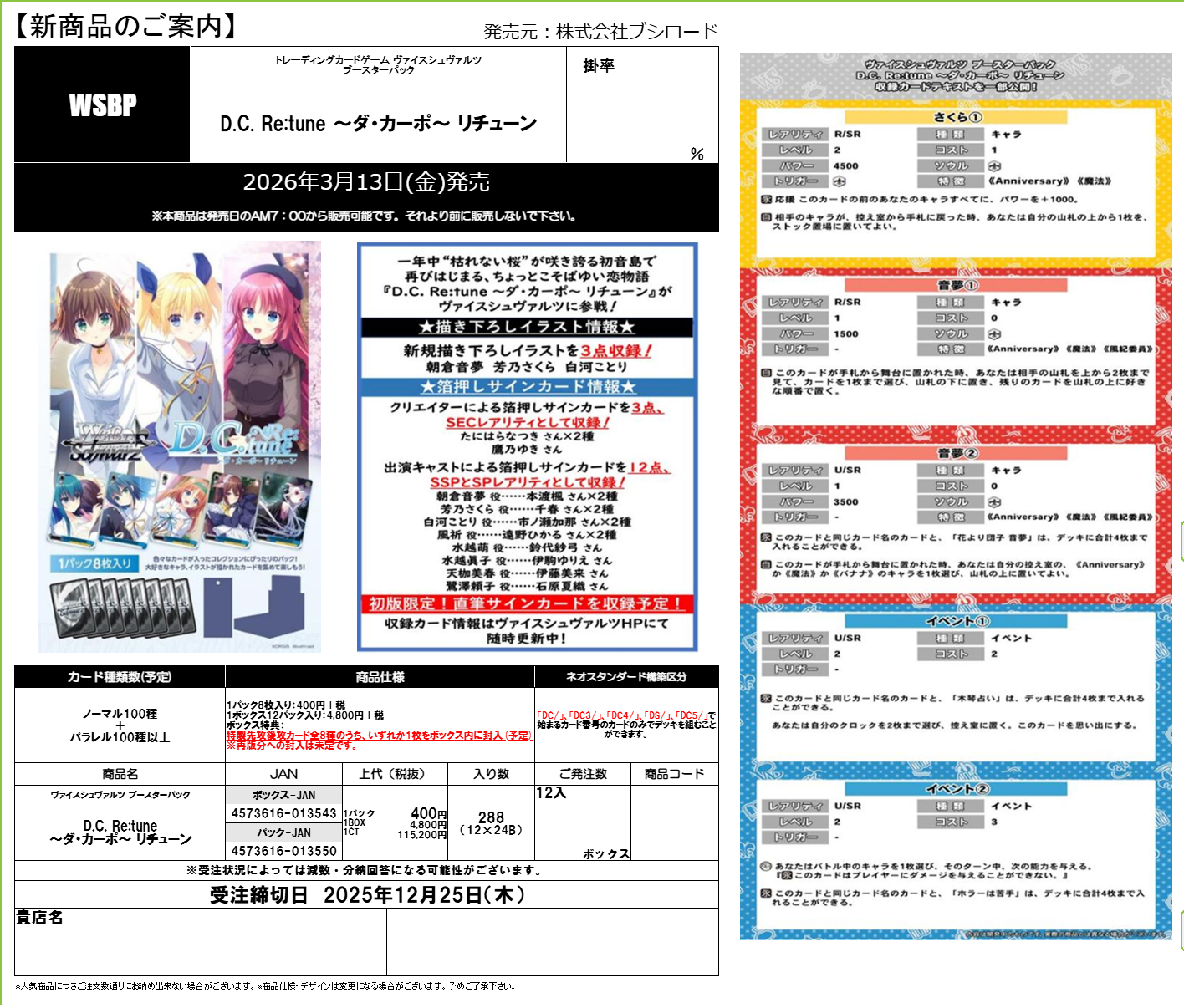 【予約商品】ヴァイスシュヴァルツ ブースターパック 『D.C. Re:tune 〜ダ・カーポ〜 リチューン』 BOX(12パック入り)【26年3月13日発売】 [4573616013550]