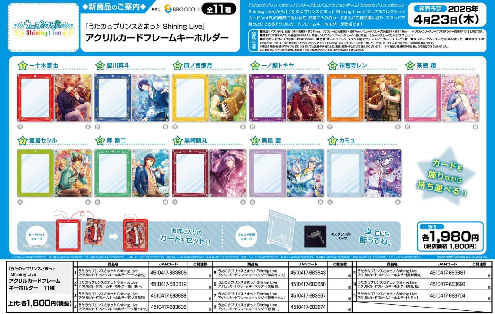 『うたの☆プリンスさまっ♪』シリーズの リズムアクションゲーム『うたの☆プリンスさまっ♪ Shining Live』から、 「うたの☆プリンスさまっ♪ Shining Live ビジュアルコレクションカード Vol.5」の発売に合わせて、 お気に入りのカードを入れて持ち運んだり、スタンドで飾ったりできる アクリルカードフレームキーホルダーが登場です! ※画像は商品デザインではなくイメージになります。 加工の関係で若干色の違う部分がある場合がございますので、ご了承ください。 |