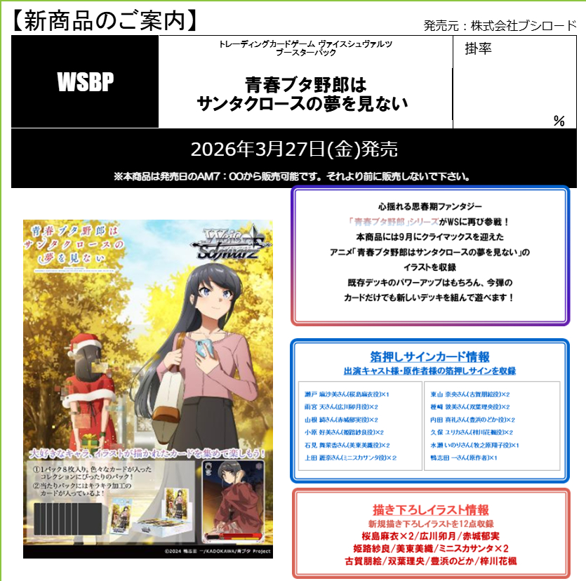 ヴァイスシュヴァルツ ブースターパック 『青春ブタ野郎はサンタクロースの夢を見ない』 BOX(12パック入り)