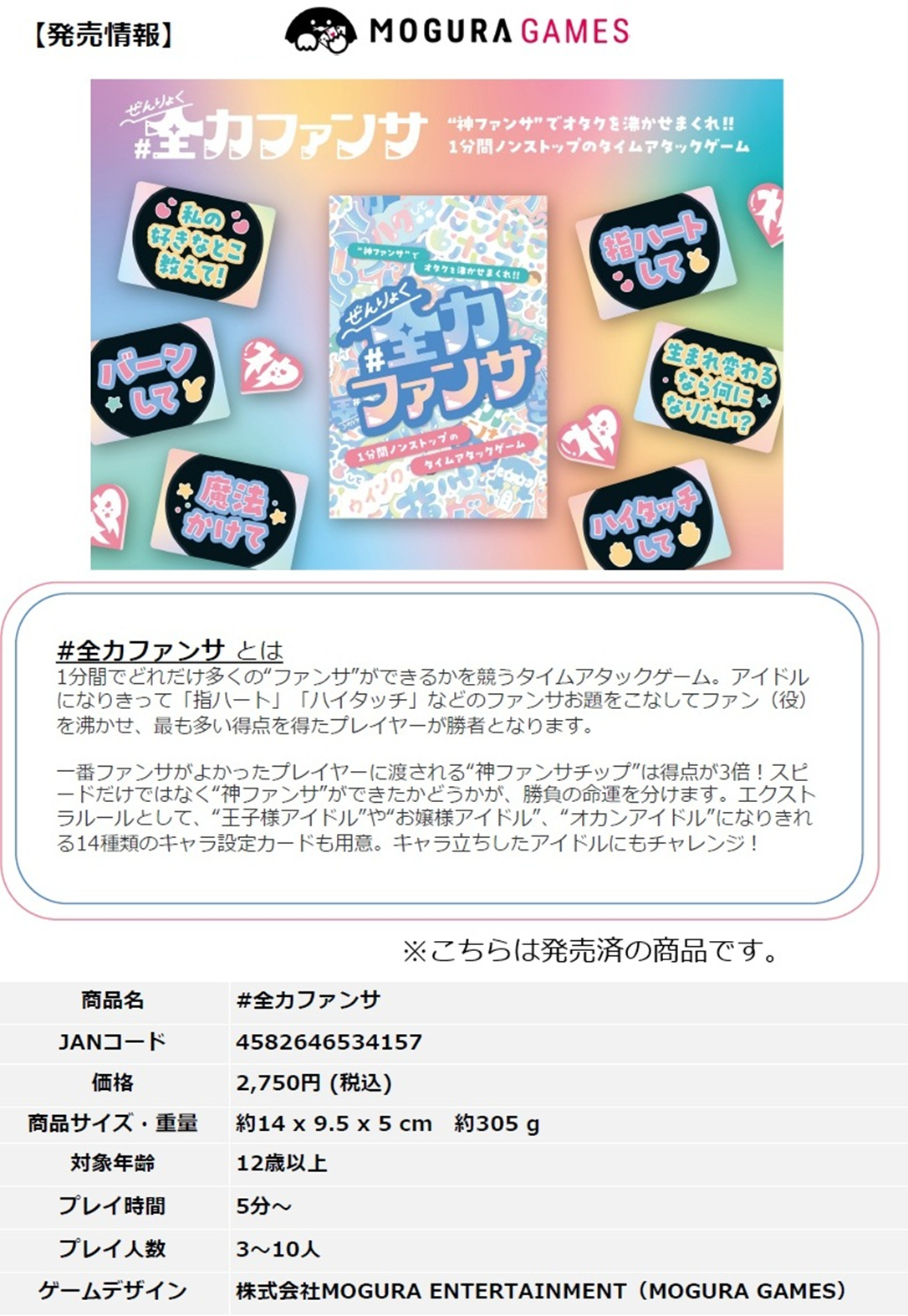 プレイ人数:3〜10人 対象年齢:12歳以上 プレイ時間:約5分〜 ※ こちらの商品は人気商品のため、メーカー様からの納品数カットや分納となる可能性がございます。 あらかじめご了承ください。 ※ゲームのプレイに支障のない初期傷や軽微な外装のフィルム破損等につきましては一切補償できません。 ご了承ください。 (26年1月13日ご予約締め切り予定 ※より早期に受付終了する可能性がございます) |