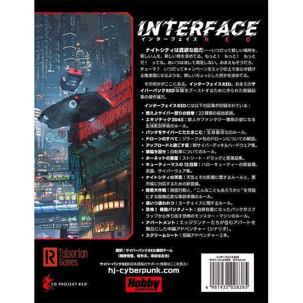 暗黒の未来を拡張する追加ルール&ガジェット集 『インターフェイスRED』は、サイバーパンクREDのプレイ体験を拡張する短編記事の傑作選で、サイバーパンクRED英語版公式サイトで公開されている ダウンロードコンテンツの中から、特に有用で面白い人気記事をピックアップして一冊にまとめた日本語版だけの特別仕様になっております。 プレイヤー・キャラクターの強化や、より個性的にするための武術や追加アイテム。 チェイスやステルス、ナイトシティの特殊な天候など、セッションにおいて多彩なシチュエーションを表現するためのスポット・ルール。 ドローンや新たなサイバーデッキなどのテクノロジーの数々。 上述した内容の他、初心者プレイヤー向けのアドベンチャー・シナリオも充実し、プレイヤーからゲームマスターまで、 すべてのサイバーパンクREDファン必携の一冊となっております。 本書の主な掲載内容 ・『燃えよサイバー怒りの鉄拳』:23種類の追加武術。 ・『パンクをサイバーに叩き込む』:全身義体化のルール。 ・『キューティーマスの12日間』:ハローキューティーの新装備、武器、サイバーウェア集。 ・『隠密大作戦』:隠密行動と、“こんなこともあろうかと”を可能にする事前準備のルール。 ・『追いつ追われつ』:カーチェイスのルール。 ・『恐怖!機動パンクノート』:スクラップからモンスター・マシンを作成するためのルール。 ・『アパートメント』:中編アドベンチャー・シナリオ。 ほか、全13記事 対象年齢:14歳以上 ※ こちらの商品は人気商品のため、メーカー様からの納品数カットや分納となる可能性がございます。 あらかじめご了承ください。 ※ゲームのプレイに支障のない初期傷や軽微な外装のフィルム破損等につきましては一切補償できません。 ご了承ください。 (26年1月15日ご予約締め切り予定 ※より早期に受付終了する可能性がございます) |