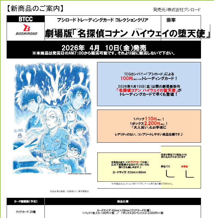 TCGカンパニー「ブシロード」がおくる100円(税込110円)トレーディングカード! 2026年4月10日(金)公開の劇場最新作「名探偵コナン ハイウェイの堕天使」がトレーディングカードで早くも登場!br> 1パック110円(税込)! 1ボックス2,200円(税込)! 「大人買い」もお手頃に レアリティのない、コンプリートしやすい商品仕様です♪ 本商品は全カードがクリアカード仕様! 丈夫で高級感があるのでいろいろな飾り方も楽しめます♪ カードサイズ:63mm×89mm 24箱以上ご購入のお客様には(基本的に)カートンの中身を入れ替えず、出荷しております。 ※ こちらの商品は人気商品のため、メーカー様からの納品数カットや分納となる可能性がございます。 あらかじめご了承ください。 |