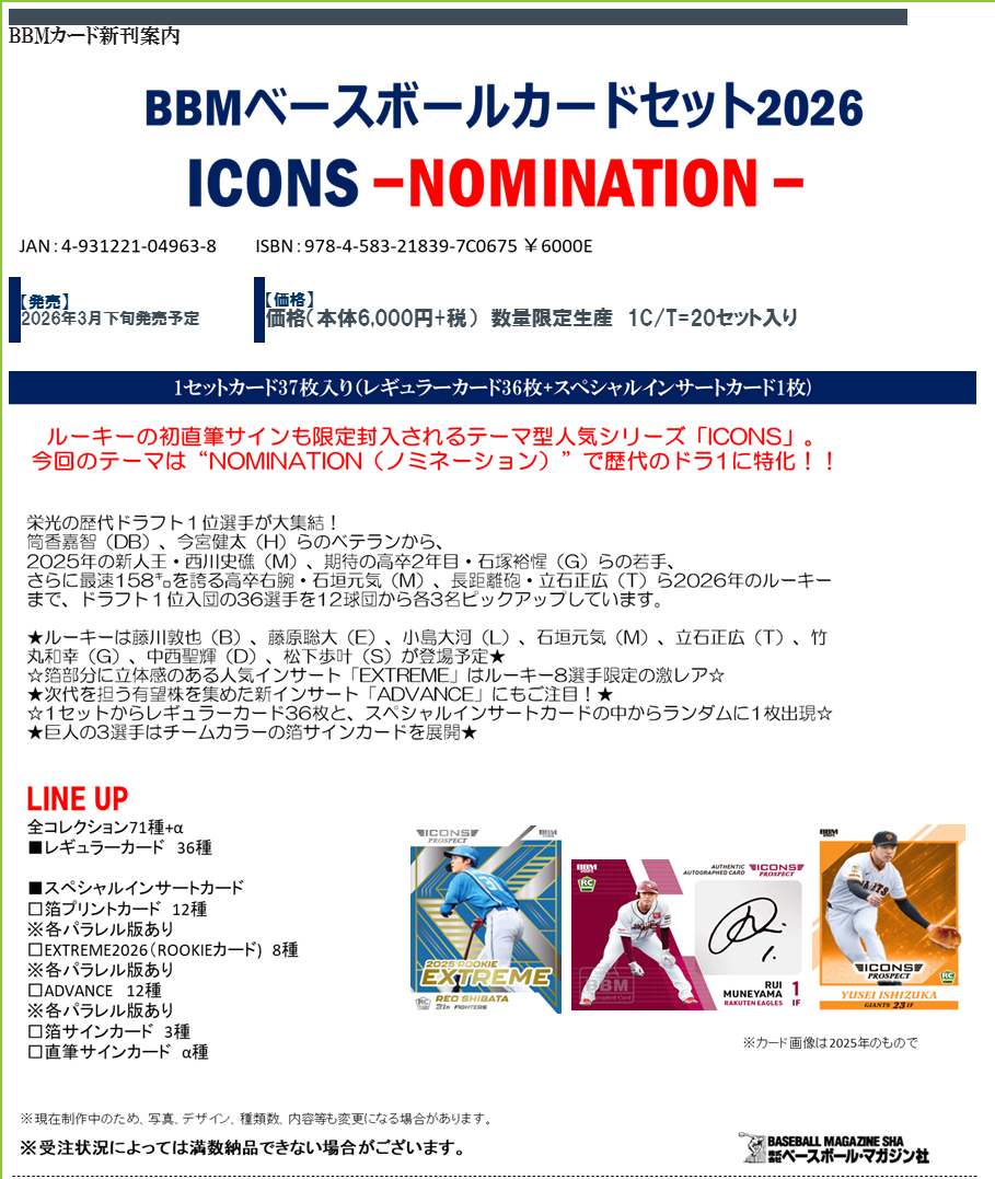 BBMベースボールカードセット2026 ICONS −NOMINATION −【26年3月下旬発売】 [4931221049638]