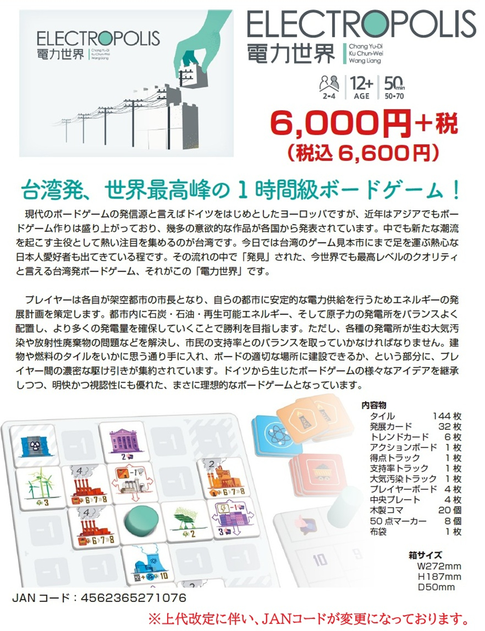 現代のボードゲームの発信源と言えばドイツをはじめとしたヨーロッパですが、近年はアジアでもボードゲーム作りは盛り上がっており、 幾多の意欲的な作品が各国から発表されています。 中でも新たな潮流を起こす主役として熱い注目を集めるのが台湾です。 今日では台湾のゲーム見本市にまで足を運ぶ熱心な日本人愛好者も出てきている程です。 その流れの中で「発見」された、今世界でも最高レベルのクオリティと言える台湾発ボードゲーム、 それがこの「電力世界」です。 プレイヤーは各自が架空都市の市長となり、自らの都市に安定的な電力供給を行うためエネルギーの発展計画を策定します。 都市内に石炭・石油・再生可能エネルギー、そして原子力の発電所をバランスよく配置し、より多くの発電量を確保していくことで勝利を目指します。 ただし、各種の発電所が生む大気汚染や放射性廃棄物の問題などを解決し、市民の支持率とのバランスを取っていかなければなりません。 建物や燃料のタイルをいかに思う通り手に入れ、ボードの適切な場所に建設できるか、という部分に、プレイヤー間の濃密な駆け引きが集約されています。 ドイツから生じたボードゲームの様々なアイデアを継承しつつ、明快かつ視認性にも優れた、 まさに理想的なボードゲームとなっています。 対象年齢:12歳以上 プレイ人数:2〜4 プレイ時間:50分〜70分 箱サイズ:272×187×50mm ※ こちらの商品は人気商品のため、メーカー様からの納品数カットや分納となる可能性がございます。 あらかじめご了承ください。 ゲームのプレイに支障のない初期傷や 軽微な外装のフィルム破損等につきましては一切補償できません。 ご了承ください。 (26年2月12日ご予約締め切り予定 ※より早期に受付終了する可能性がございます) |