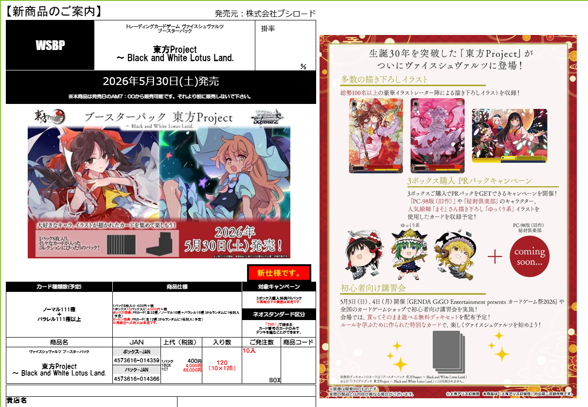 ヴァイスシュヴァルツ ブースターパック 『東方Project 〜 Black and White Lotus Land.』 BOX(10パック入り)