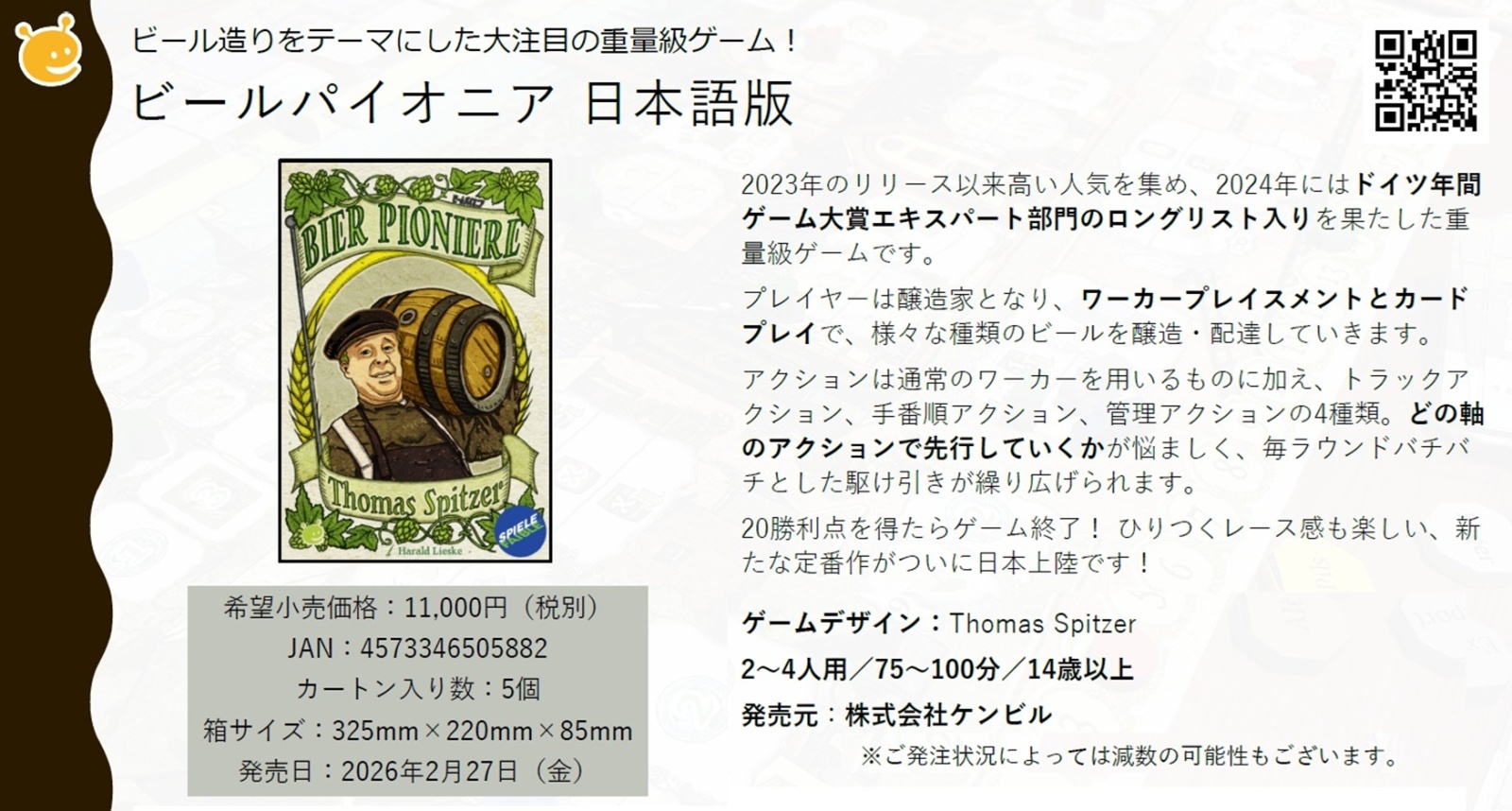 ビール造りをテーマにした大注目の重量級ゲーム! 2023年のリリース以来高い人気を集め、2024年にはドイツ年間ゲーム大賞エキスパート部門の ロングリスト入りを果たした重量級ゲームです。 プレイヤーは醸造家となり、ワーカープレイスメントとカードプレイで、様々な種類のビールを醸造・配達していきます。 アクションは通常のワーカーを用いるものに加え、トラックアクション、手番順アクション、管理アクションの4種類。 どの軸のアクションで先行していくかが悩ましく、毎ラウンドバチバチとした駆け引きが繰り広げられます。 20勝利点を得たらゲーム終了! ひりつくレース感も楽しい、新たな定番作がついに日本上陸です! プレイ人数:2〜4人 所要時間:75〜100分 対象年齢:14歳以上 箱サイズ:325×220×85mm (26年2月16日ご予約締め切り予定 ※より早期に受付終了する可能性がございます) ゲームのプレイに支障のない初期傷や軽微な外装のフィルム破損等につきましては一切補償できません。 ご了承ください。 人気の高い商品のため、ご注文後に減数や発売日遅延が発生する可能性がございます。 ご了承ください。 |