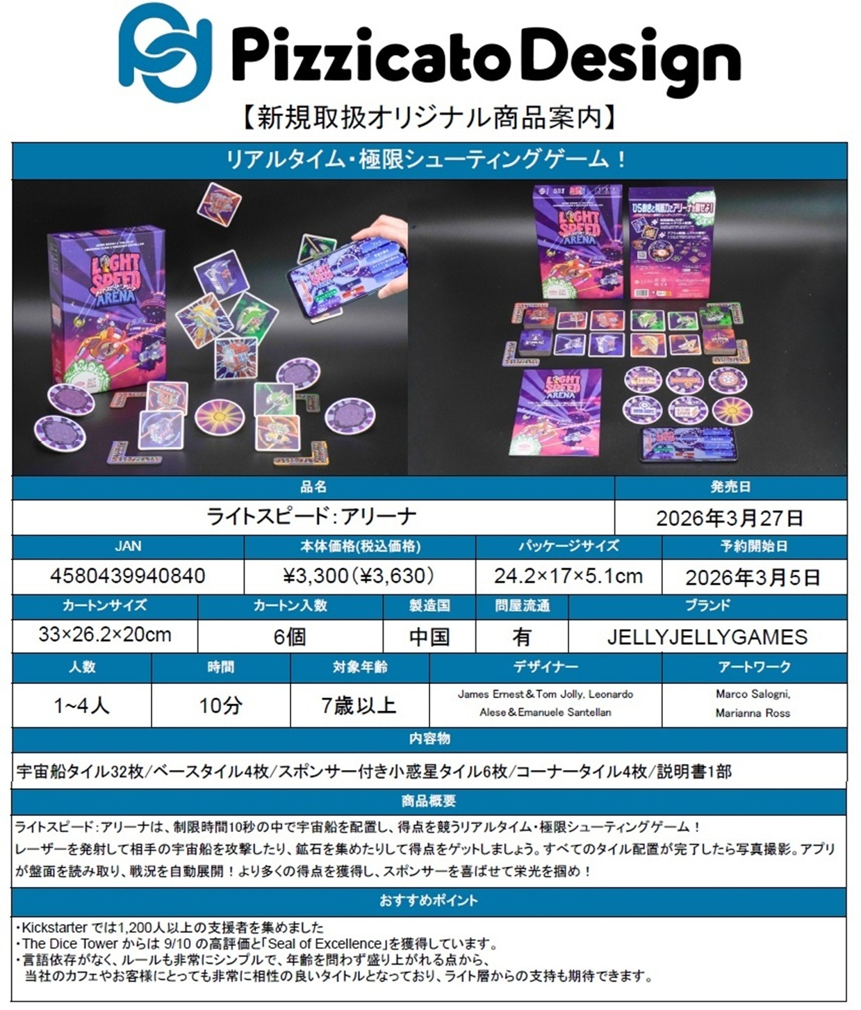 【お取り寄せ商品】表記のある商品は確保まで数日いただく可能性がございます。 また問屋様に在庫がない可能性も多々ございます。ご容赦ください。 スマートフォンのアプリで戦闘が展開されていくリアルタイム・シューティングゲームです! 時間内にタイルを配置して狙いを定めたら、スマートフォンやタブレットの専用アプリでボード全体の写真を撮影することで、 アプリ上で戦闘を展開してくれます。 宇宙船タイルをリアルタイムで戦略的に配置し、敵を撃破したり、小惑星から鉱石を採集することで、スポンサーを喜ばせ、 より多く得点したプレイヤーの勝利です! プレイ時間:10分 プレイ人数:1〜4人 対象年齢:7歳以上 商品サイズ 124.2×17×5.1cm ※ こちらの商品は人気商品のため、メーカー様からの納品数カットや分納となる可能性がございます。 あらかじめご了承ください。 ゲームのプレイに支障のない初期傷や 軽微な外装のフィルム破損等につきましては一切補償できません。 ご了承ください。 |