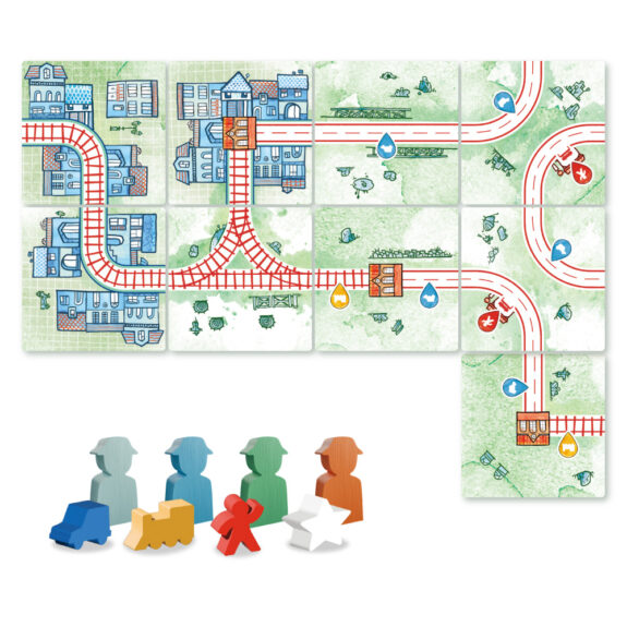 <内容物> ・ルートタイル:106枚 ・施設タイル:28枚 ・列車コマ:18個 ・自動車コマ:18個 ・旅客コマ:18個 ・星コマ:10個 ・プレイヤーコマ:4個 ・駅ボード:1枚 ・配置マーカー:7個 ・勝利点トークン:64個 ・袋:1枚 ・2人用ゲームマーカー:1個 ・ルール説明書:1冊 |