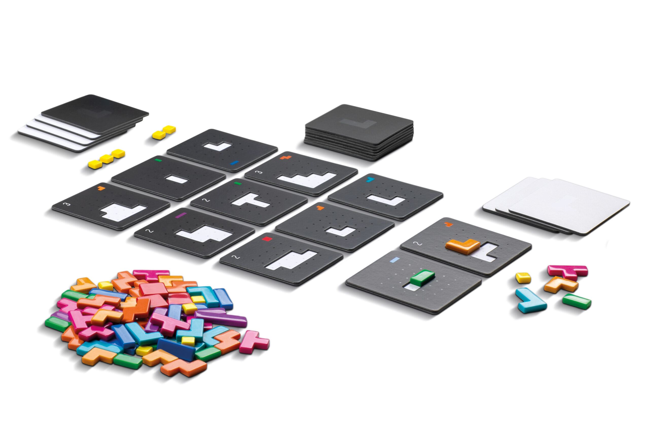 <内容物> パズルピース90個、パズル52枚、 プレイヤーガイド4枚、多言語版ルール |