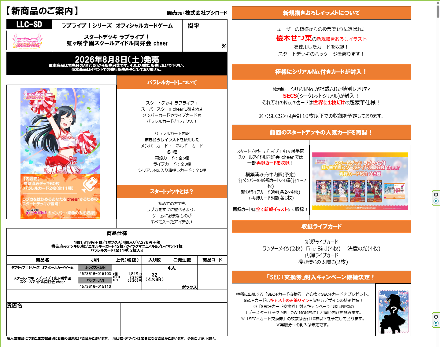 パラレルカードについて スタートデッキ ラブライブ!スーパースター!! cheerに引き続きメンバーカードやライブカードもパラレルカードとして封入! パラレルカード内訳 描きおろしイラストを使用したメンバーカード・エネルギーカード:各1種 再録カード:全5種 ライブカード:全3種 シリアルNo.入り箔押しカード:全1種 ラブライブ!シリーズ オフィシャルカードゲームとは 「ラブライブ!シリーズ オフィシャルカードゲーム」は集めたカードで競い合う1対1の対戦カードゲーム。 「みんなでつくるカードゲーム」をコンセプトにルールの一部や、今後の登場“スクールアイドル”など あなたの意見で未来が変わる! ※ こちらの商品は人気商品のため、メーカー様からの納品数カットや分納となる可能性がございます。 あらかじめご了承ください。 |