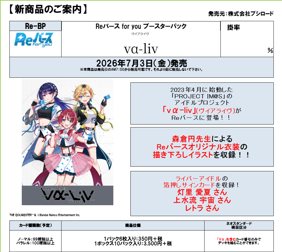 | 詳細 | 2023年4月に始動した「PROJECT IM@S」のアイドルプロジェクト 「vα-liv」(ヴイアライヴ)がReバースに登場!! 森倉円先生によるReバースオリジナル衣装の描き下ろしイラストを収録!! ライバーアイドルの箔押しサインカードを収録! 灯里 愛夏 さん 上水流 宇宙 さん レトラ さん 32箱以上ご購入のお客様には(基本的に)未開封カートンに送り状を添付し 発送する予定となっております。 ご購入をご検討いただけますと幸いです。 ※ こちらの商品は人気商品のため、メーカー様からの納品数カットや分納となる可能性がございます。 あらかじめご了承ください。 (26年5月1日ご予約締め切り予定 ※より早期に受付終了する可能性がございます) |