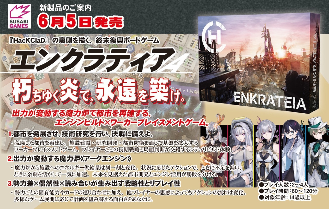 朽ちゆく炎で、永遠を築け。 『HacKClaD』シリーズ完全新作! 出力が変動する魔力炉で都市を再建する、エンジンビルド×ワーカープレイスメントゲーム。 ゲームデザインに『異世界ギルドマスターズ』、『メゾン・ド・ナイトメア』など数々のヒット作を手掛けた蜂月氏、 プロデュースに『HacKClaD』や『アイドルアライブ』などを手掛けた、かくのタッグで送る本格重量級ボードゲーム。 <本作の特徴> ・出力が変動するエンジンを駆使し、最適な資源生産プランを組み立てる戦略性 ・ワーカープレイスメントの駆け引きを加速させる、キャラクター固有能力 ・『HacKClaD』の戦いの裏側が描かれるスピンオフ作品 プレイ人数:2〜4人 プレイ時間:60〜120分 対象年齢:14歳〜 ゲームデザイン:蜂月 イラストレータ:J歯車ラプト、たき 箱サイズ:311×224×60mm ※ こちらの商品は人気商品のため、メーカー様からの納品数カットや分納となる可能性がございます。 あらかじめご了承ください。 ゲームのプレイに支障のない初期傷や 軽微な外装のフィルム破損等につきましては一切補償できません。 ご了承ください。 (26年5月1日ご予約締め切り予定 ※より早期に受付終了する可能性がございます) |